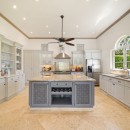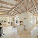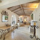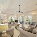 Through arched doors you enter the great room with a pickled wood ceiling, marble floors and palette of stylish black and white. You never cease to catch views of the grounds through the doors as you recline in the living room, take a meal in the dining room or even sit at the marble topped kitchen island.