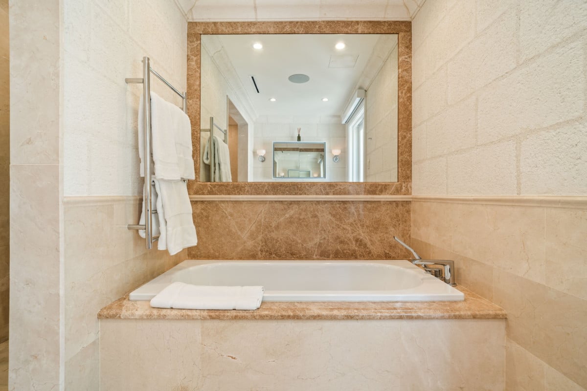 Bedroom 5: Bedroom with a king-size bed, A/C, TV and en-suite bathroom with bathtub, shower, double vanity and wc. 2 guests maximum