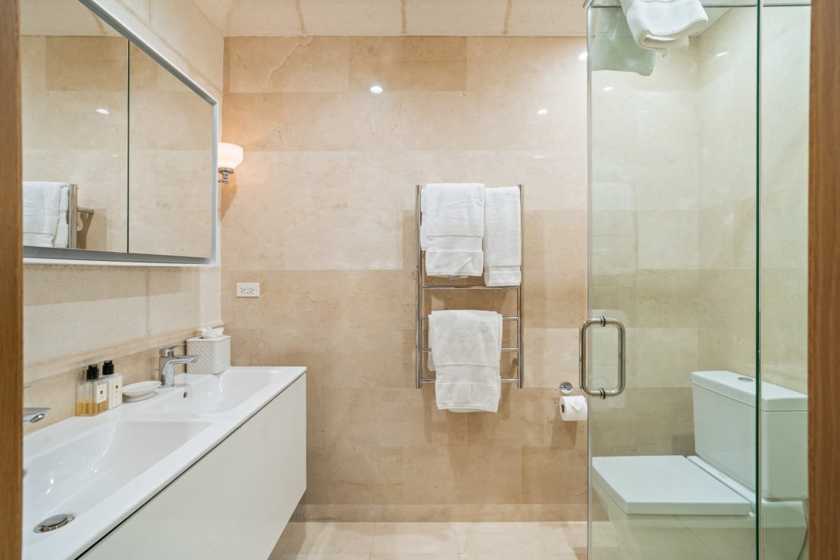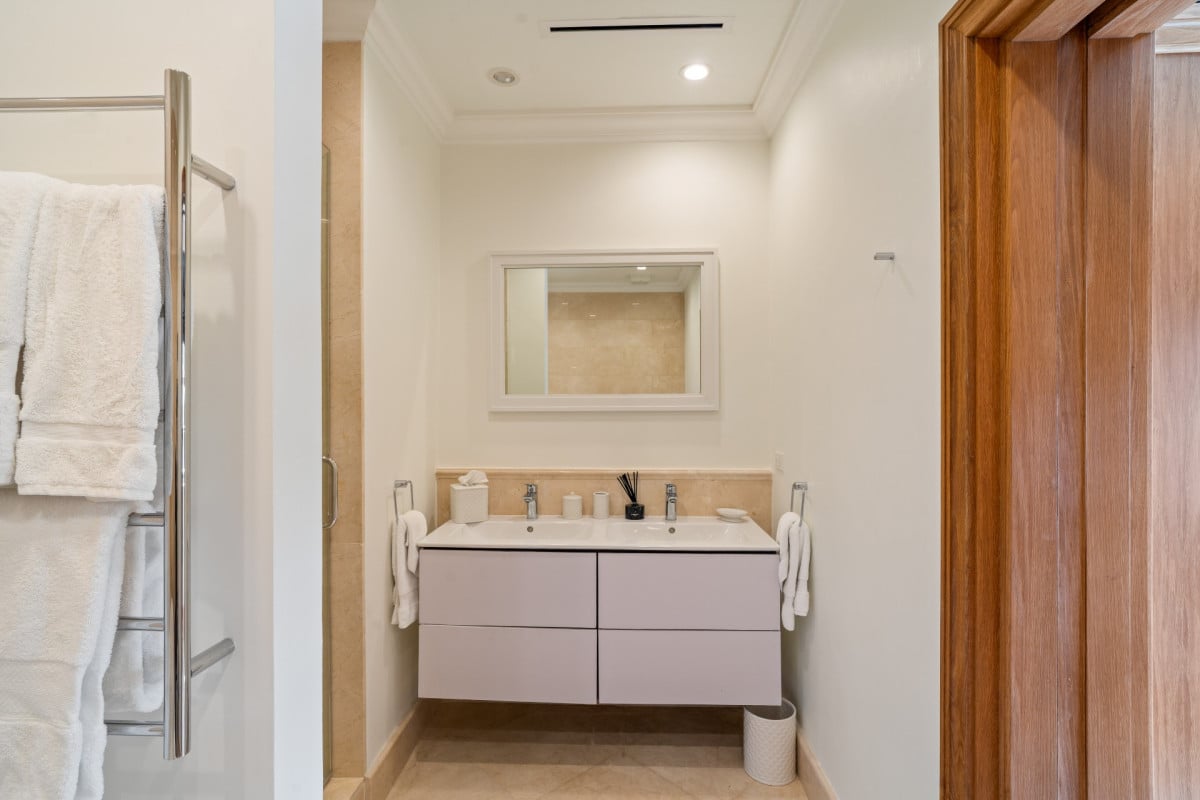 Bedroom 2: Bedroom with two single beds (can be made up as a king-size bed), A/C, TV and en-suite bathroom with shower, double vanity and WC. 2 guests maximum