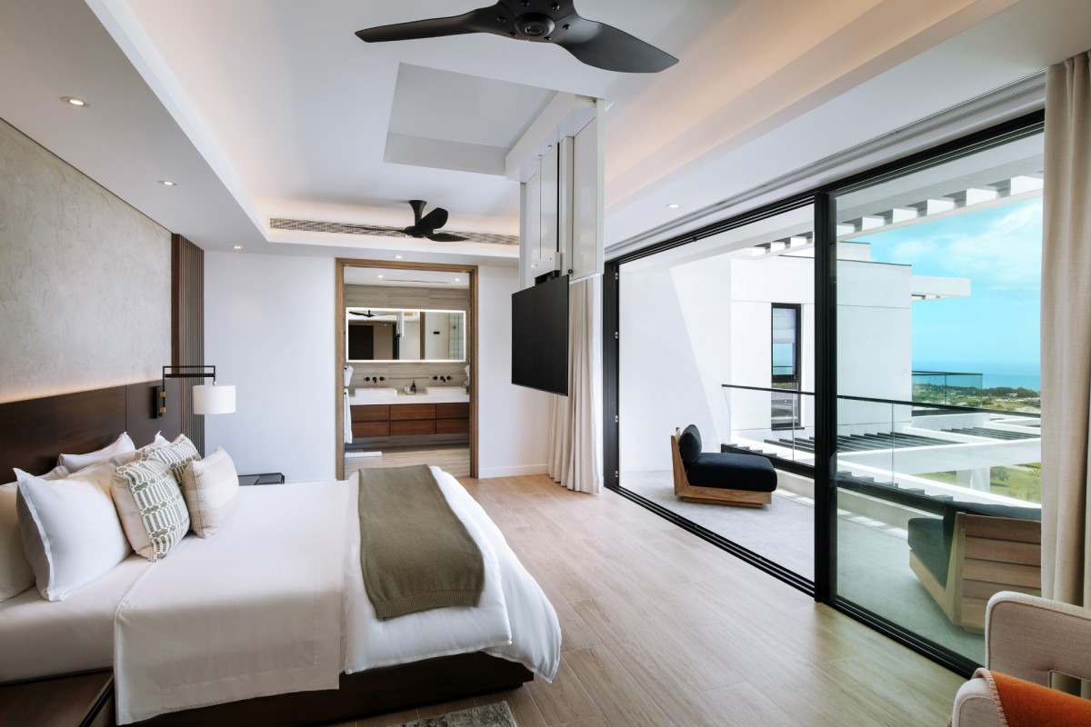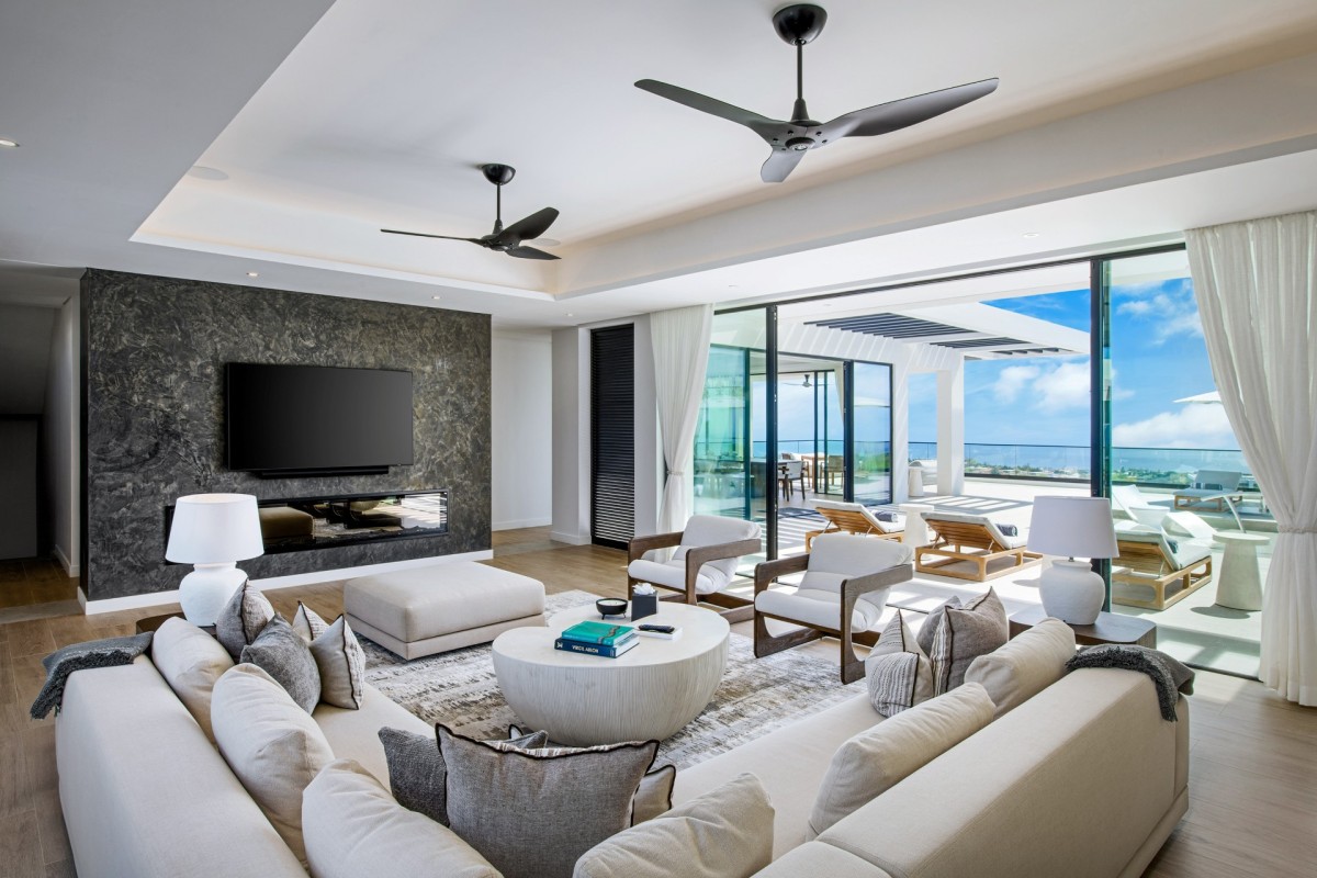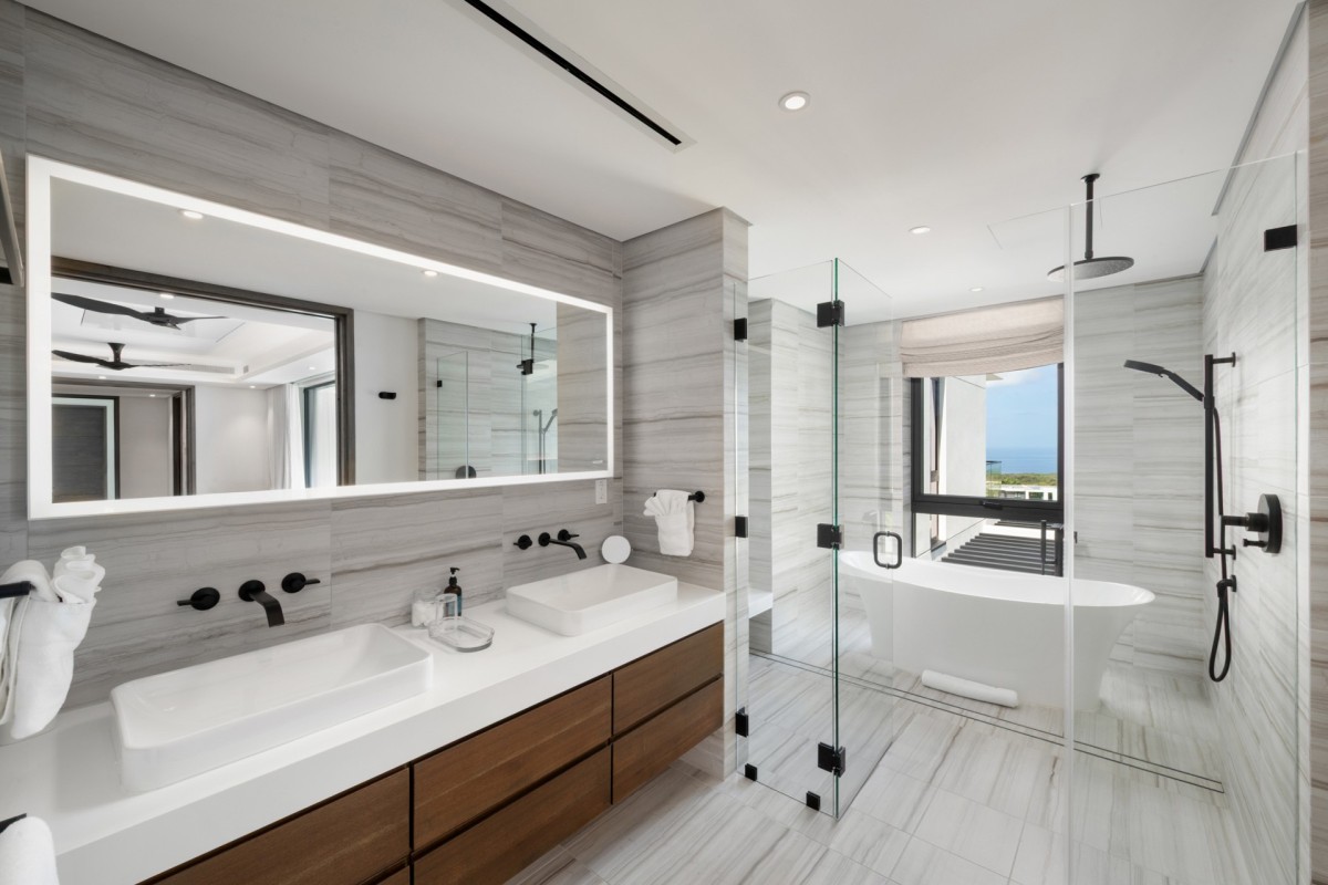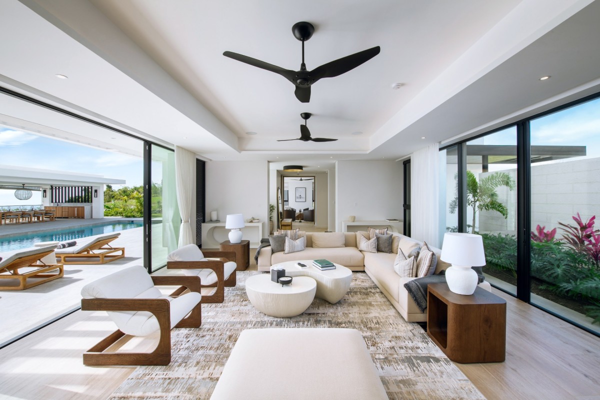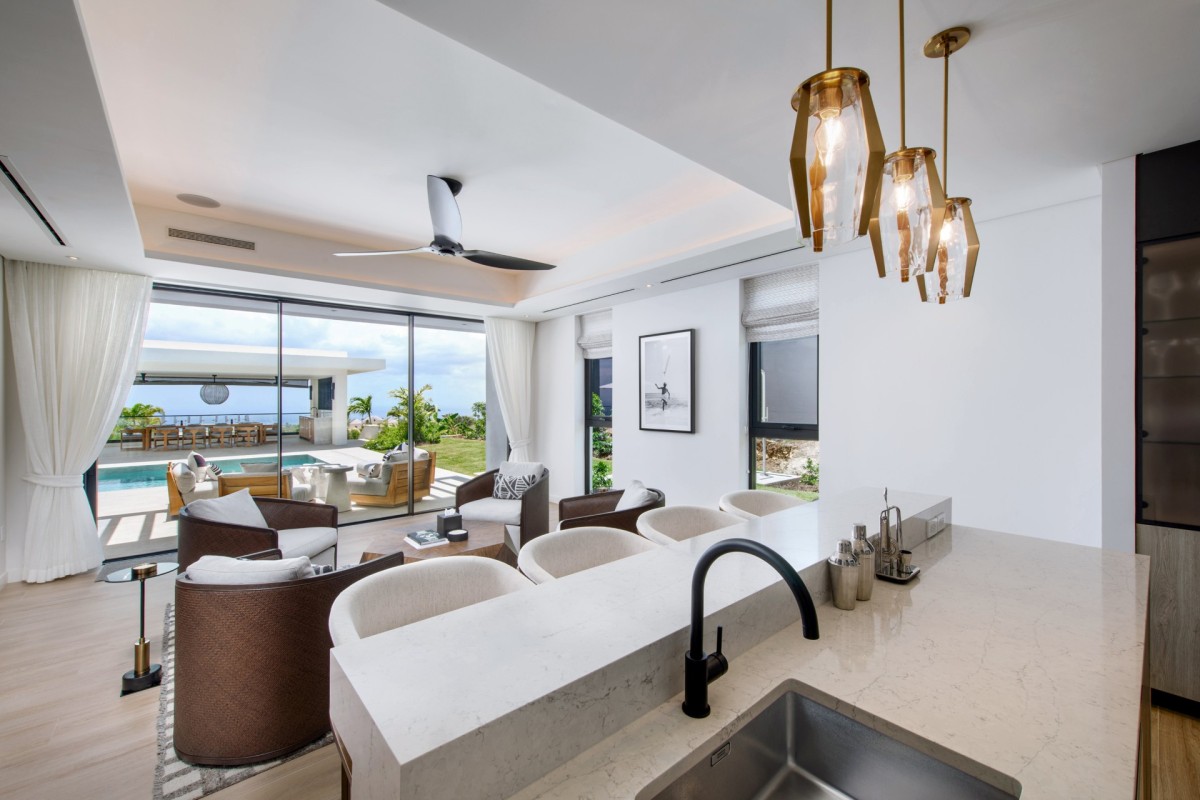 The villa is elegant, calm, and meticulously appointed. Four bedrooms are located in the main residence, each designed to offer serenity and comfort. Three ocean-facing suites feature king beds, en-suite bathrooms, and private terraces overlooking the golf course and Caribbean horizon. The fourth bedroom includes twin beds that convert to a king and enjoys a bathroom just outside the door, making it ideal for children or friends.