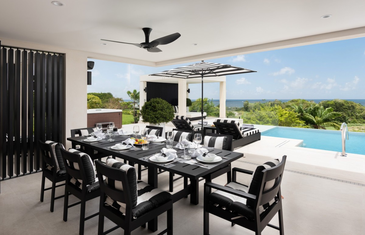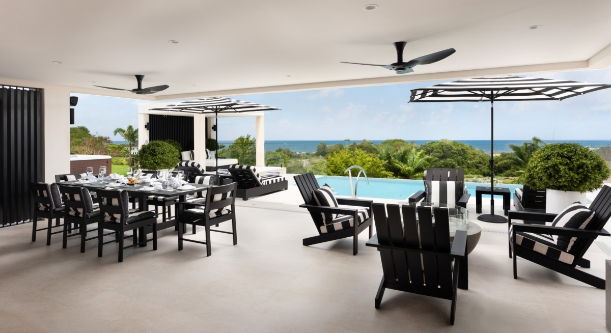 Outside, the villa’s alfresco dining terrace sets the stage for unforgettable evenings. Dine beneath the stars beside a glowing fire pit, fire up the outdoor grill, or take a dip in the infinity pool overlooking both the Caribbean Sea and the rolling greens of Apes Hill. A spacious gazebo invites lazy afternoon lounging, while the jacuzzi might just convince you to skip dinner plans altogether.