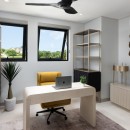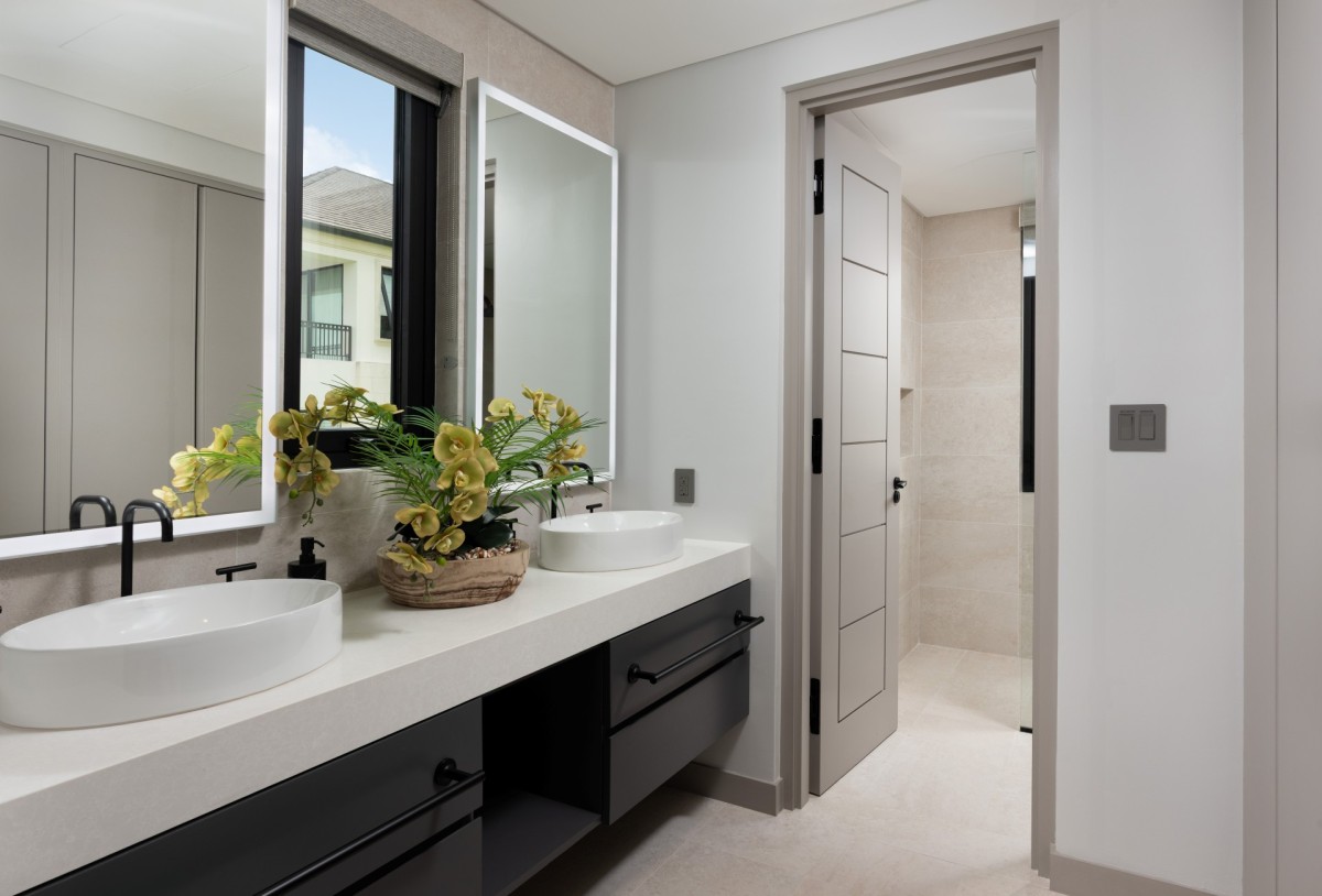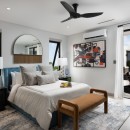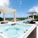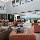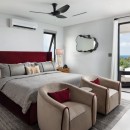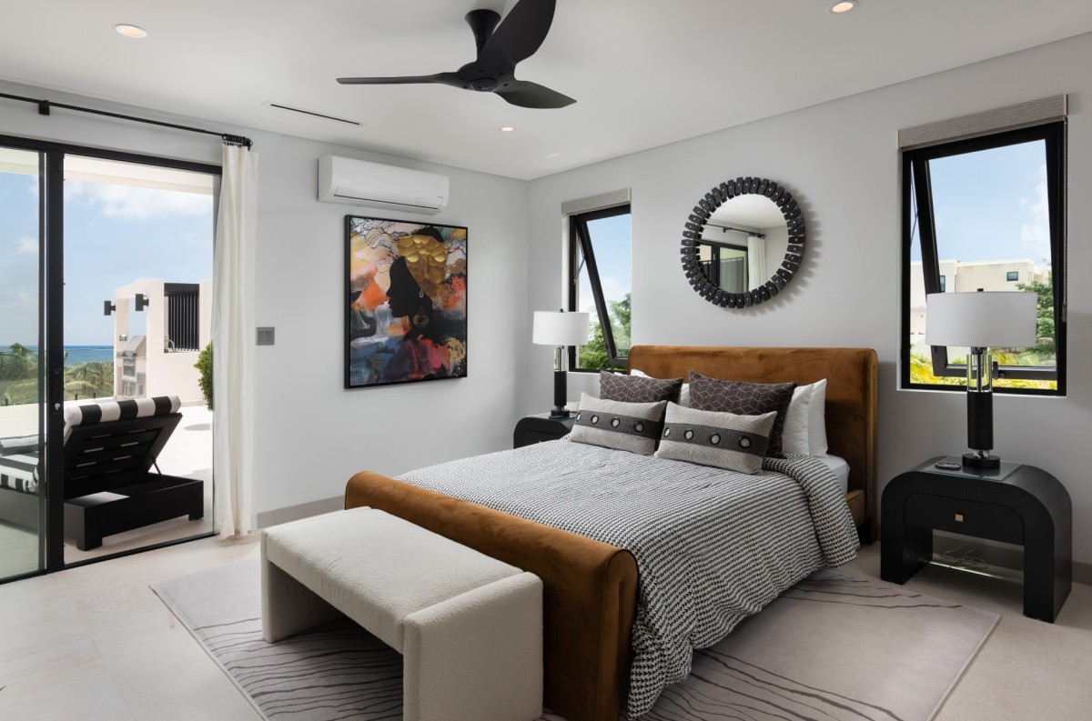 The interior palette of black and white is softened by tropical accents, creating a sophisticated yet inviting atmosphere. Two bedrooms feature king-size beds and two offer queens, each styled with its own colour scheme and private terrace or patio—perfect for slow mornings or quiet evening conversations. With two bedrooms on each floor, plus an upstairs lounge and a private office, everyone can find their own space to unwind or reconnect.
