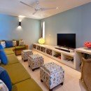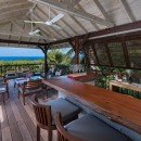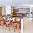 An open floor planned great room features a Balinese-style living room with modern entertainment system, and this leads to the open air kitchen. With its high-top breakfast bar and work islands, it features premium appliances and all you need for the best drinks, meals and snacks.