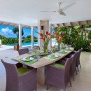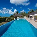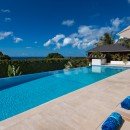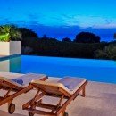 Designed in a contemporary and sophisticated style, the five-bedroom villa features an unusually welcoming exterior that includes sculptural accents in addition to the manicured grounds. There is also an expansive, infinity-edge swimming pool that leads the eye first to the gardens and then the sea beyond. Promising amazing sunsets each evening, the pool area is also a fantastic place to gather, relax and recharge.