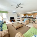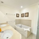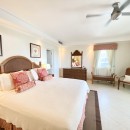 The three bedrooms all have king beds with en-suite bathrooms including showers, vanities, and water closets. All are air-conditioned with ceiling fans, televisions, and wi-fi. These are decorated in white wicker and linens, wood, marble in the bathrooms, and tile work that continues the country warmth. With three king beds, Villa Palm Beach 311 sleeps six guests, but its community atmosphere welcomes company. The pool is enormous—essentially three pools—and is shared with the community at Palm Beach (along with the fitness center).