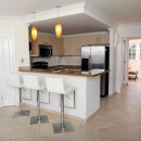 Inside the upper level of the villa is the great room with its living room, media center, dining area and fully-equipped kitchen. The space is done in an airy white palette that is nicely balanced with accents of gold and sea blue. The kitchen features stainless steel appliances and is open to the views over the breakfast bar.