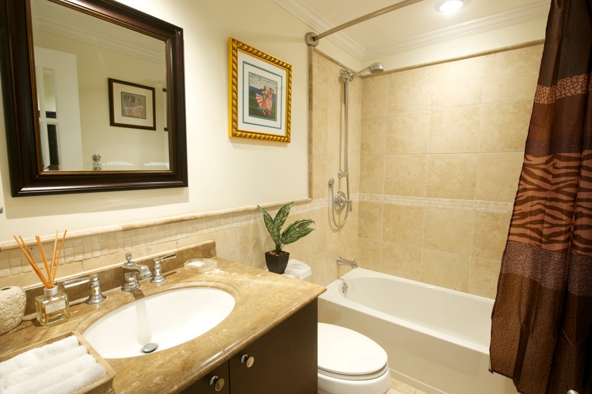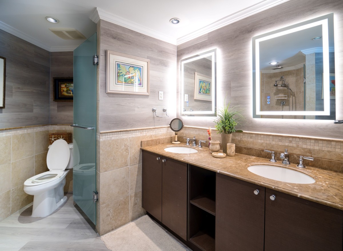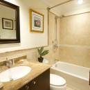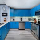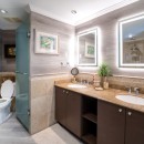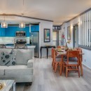There is also the shared living spaces of the great room. Decorated with custom mosaics and in a sky blue and citrus palette, it features an elegant, formal dining room, a stylish and modern breakfast bar, and a casual living room with a full entertainment system. There is an open air kitchen done in grey, black and stainless steel and is a wonderful space for making simple snacks to complex meals.