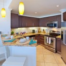 Easily living up to its name, the great room contains an oversized living room. With a blue and white nautical theme, it features oversized sofas and armchairs and a high-end entertainment system. A casually comfortable room, it opens to the breakfast bar that faces into the kitchen. This is a fully functioning, luxuriously appointed kitchen with marble counters and stainless appliances.