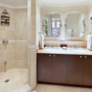 Stepping through the oversized glass doors into the great room brings you into an equally stylish space with darkly stained accent pieces and a pale palette creating a wonderfully casual style in the living room. With a full entertainment system, it is great gathering spot. There is also the appeal of the kitchen with its high-end appliances and open air breakfast bar.