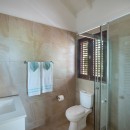 Bedroom 2: First floor bedroom with the two single beds (can be made up as king-size bed), A/C, ceiling fan, WiFi, TV, DVD, balcony access, sea view and en-suite bathroom with shower, double vanity and wc. 2 guests maximum