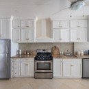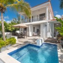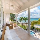 The Caribbean French-baroque vibe is alive at this beautiful seaside villa. Two stories are held up by stately white pillars and a second-floor, filigreed-iron balcony railing garters her. Pink terracotta roof tiles, classic iron lamp fixtures, and French doors that open up both floors to the island breezes complete the feel.