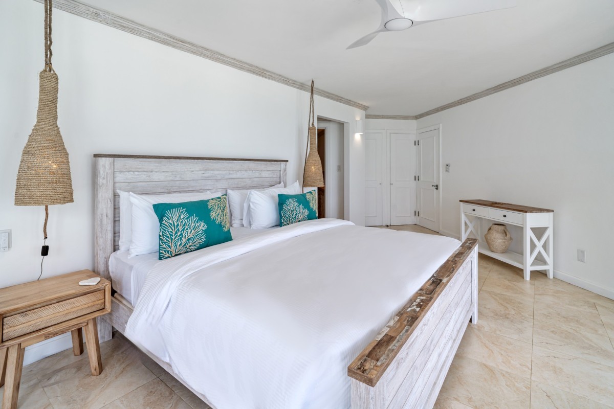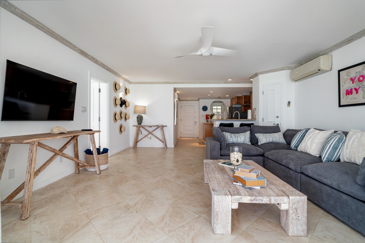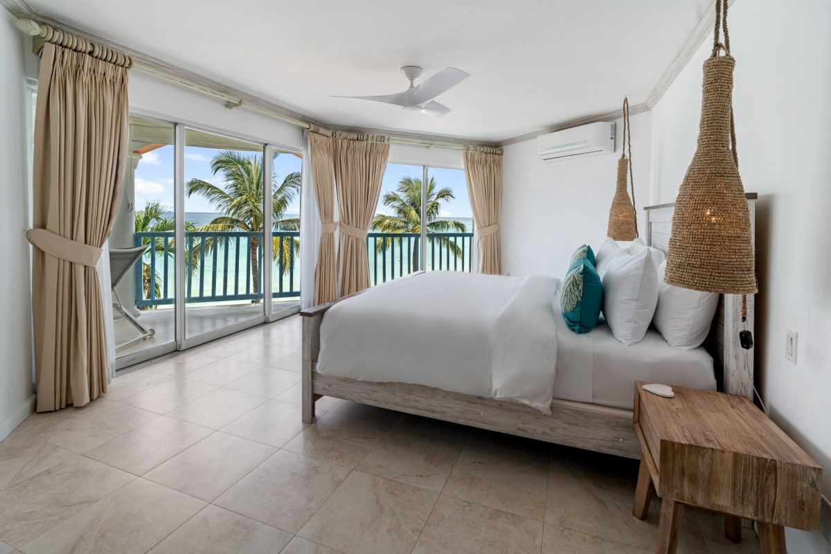 Perched on the second floor, Apartment 304 showcases sweeping views of the turquoise Caribbean Sea from your private patio. This beautifully refurbished two-bedroom, two-bathroom villa combines coastal elegance with modern comfort, featuring air conditioning and ceiling fans throughout to keep you cool in the tropical breeze.