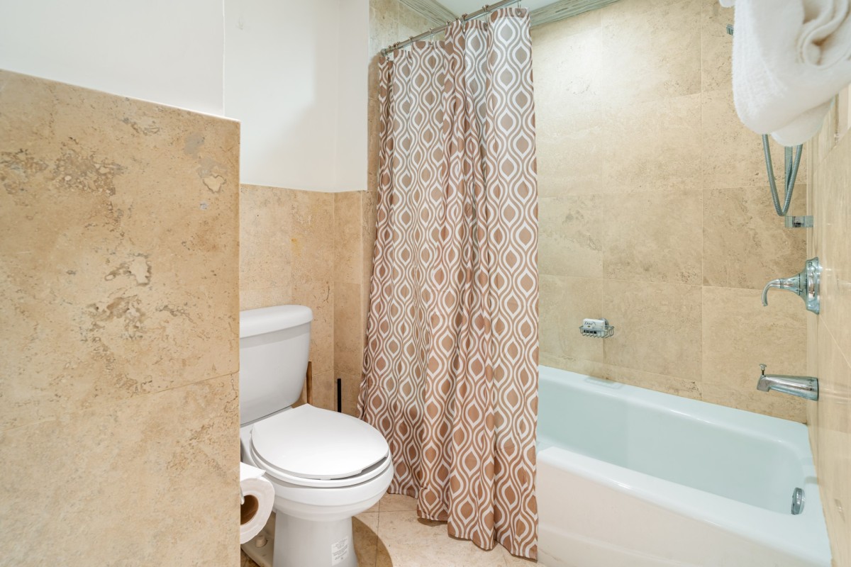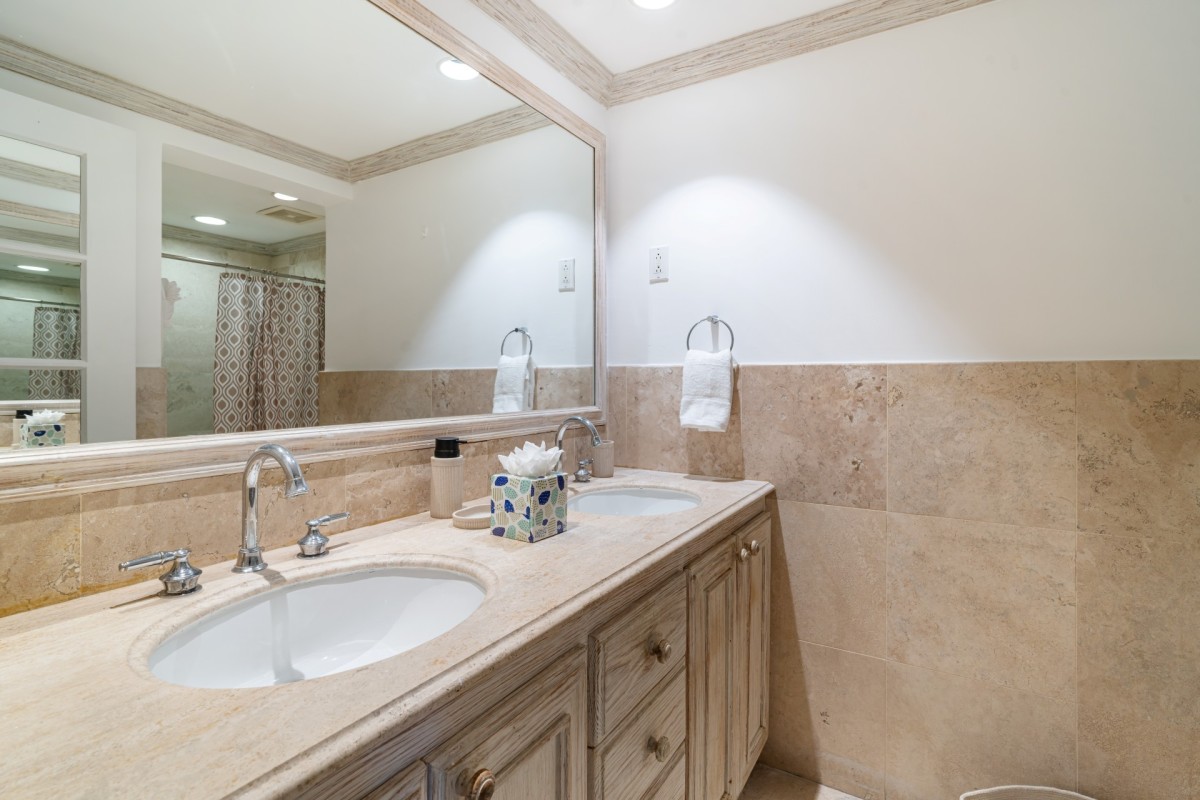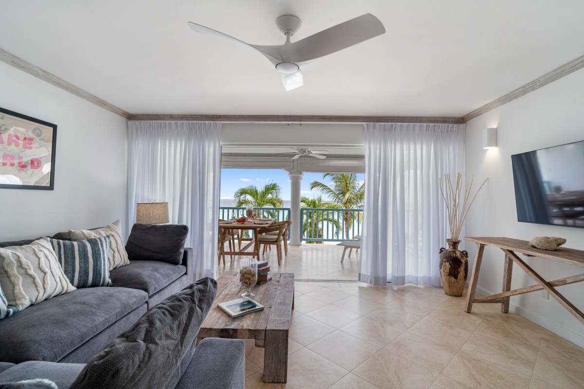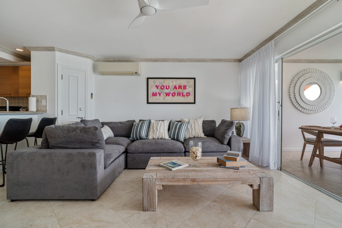 Perched on the second floor, Apartment 304 showcases sweeping views of the turquoise Caribbean Sea from your private patio. This beautifully refurbished two-bedroom, two-bathroom villa combines coastal elegance with modern comfort, featuring air conditioning and ceiling fans throughout to keep you cool in the tropical breeze.