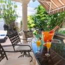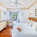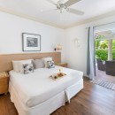 The master bedroom opens directly to a private patio, offering tranquil views of the pool and lush gardens. The second bedroom also enjoys a private patio that leads to the deck bar area. Each room promises comfort with its king-size bed and peaceful ambiance.