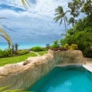 Unlike many smaller accommodations, this villa has a large covered terrace, a beachfront location, and large and airy living spaces that make it a complete destination in its own. The terrace is unique, offering a private plunge pool that is framed by a natural stone wall to ensure privacy. This leads to a comfortable lounge area as well as the al fresco dining spot that allows you to enjoy the views and breezes at all times.