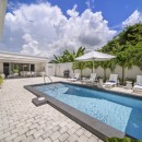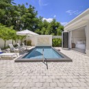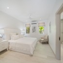 Master Suite: Your private haven with a king-size bed, direct pool access, a spacious closet, and a luxurious ensuite bathroom featuring a marble vanity and shower.