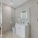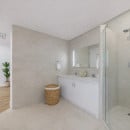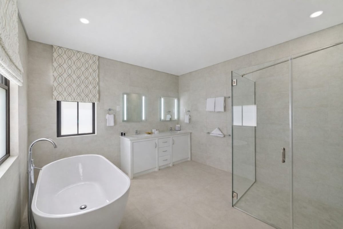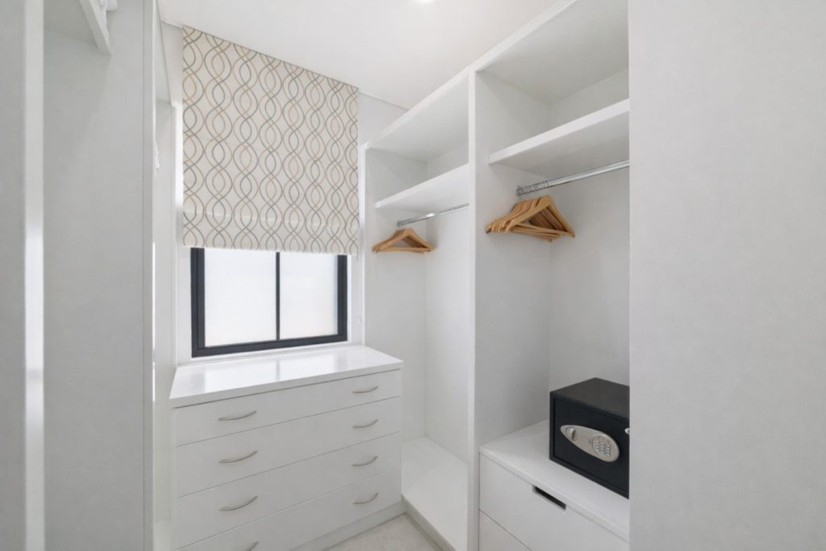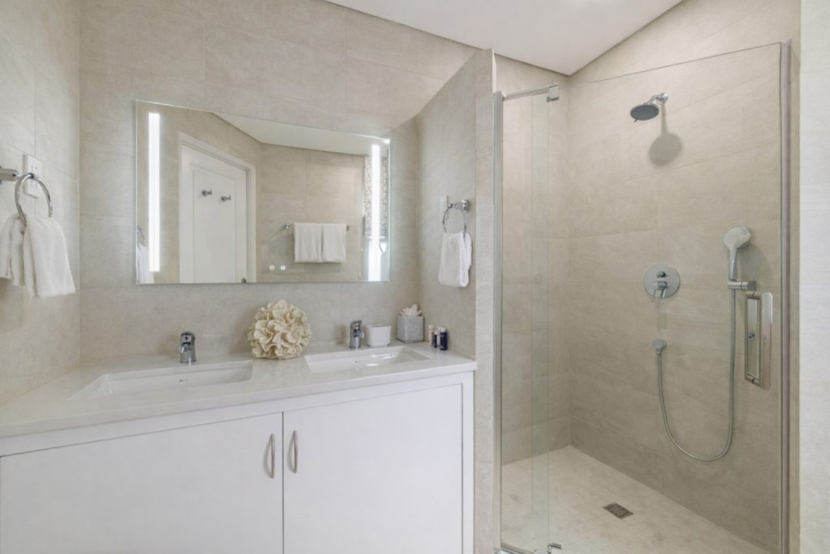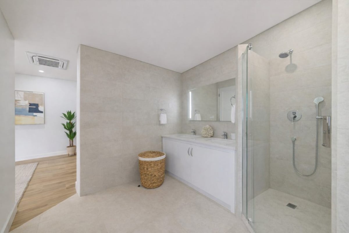The villa features four luxurious en-suite bedrooms. On the ground floor, two elegant guest suites offer comfort and convenience, each with private bathrooms and ample storage—ideal for families or guests preferring easy access.