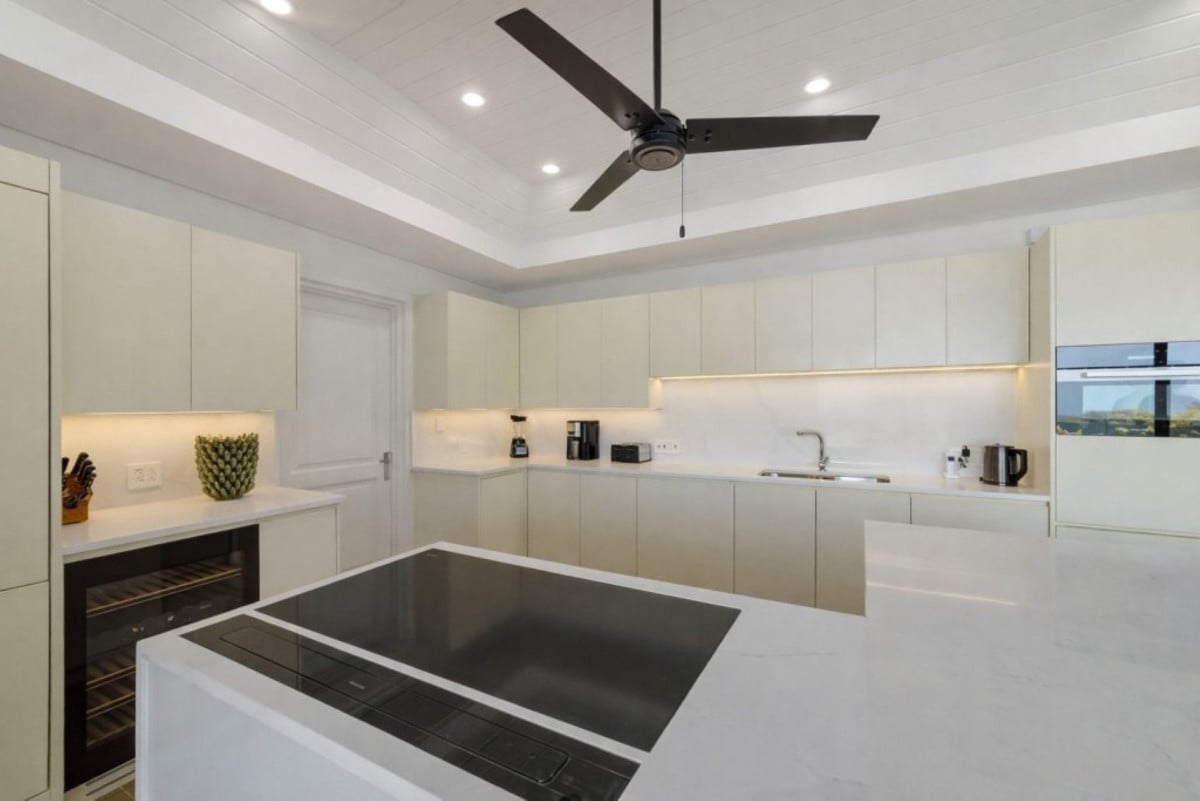 At the heart of the villa is a sleek, fully equipped gourmet kitchen with premium Miele induction appliances and generous counter space—perfect for private chef experiences or relaxed entertaining. It flows beautifully into the spacious lounge, creating an inviting atmosphere for both intimate evenings and lively gatherings. A separate utility room with a staff bathroom is conveniently tucked just off the kitchen.