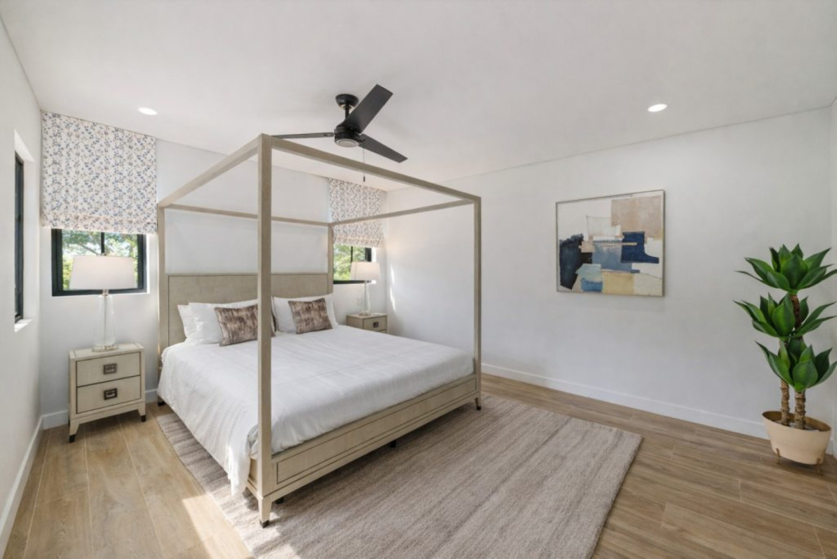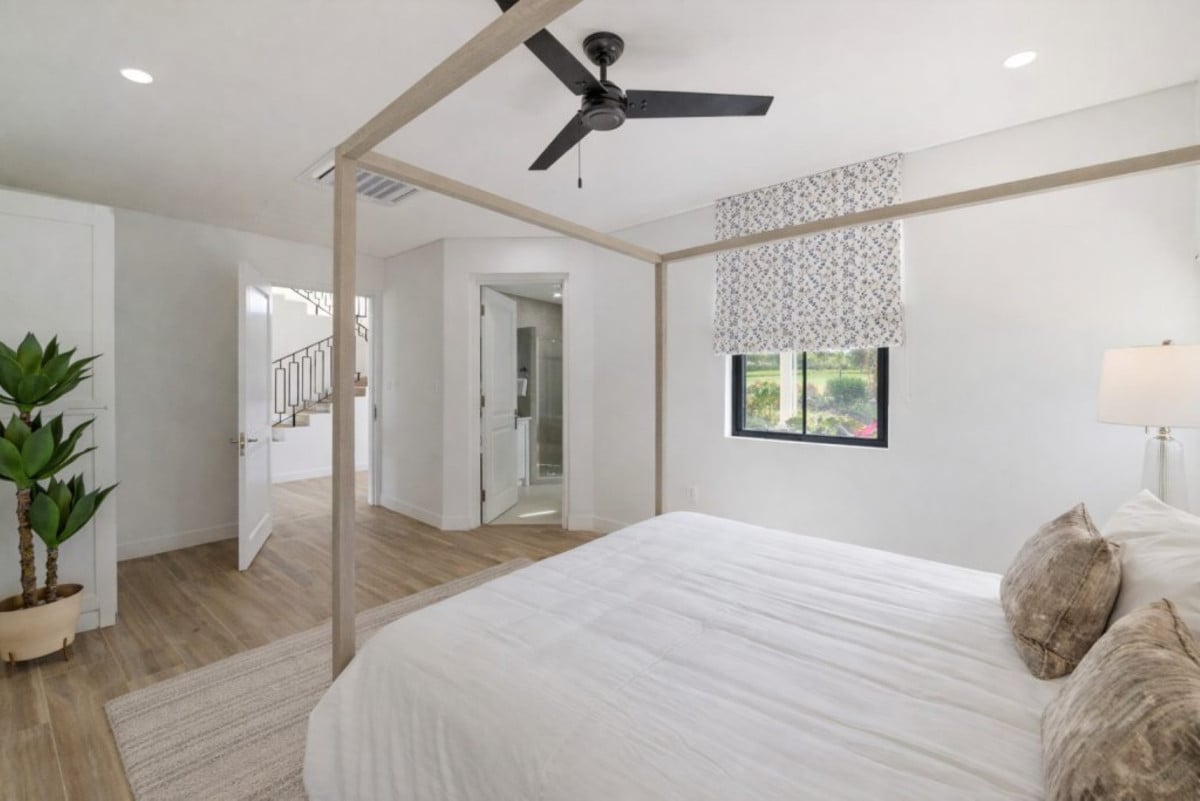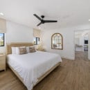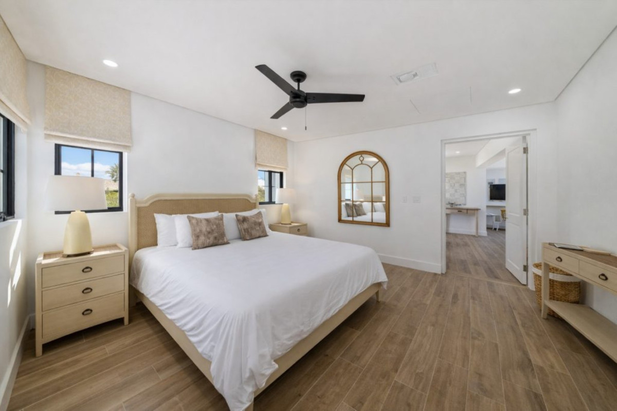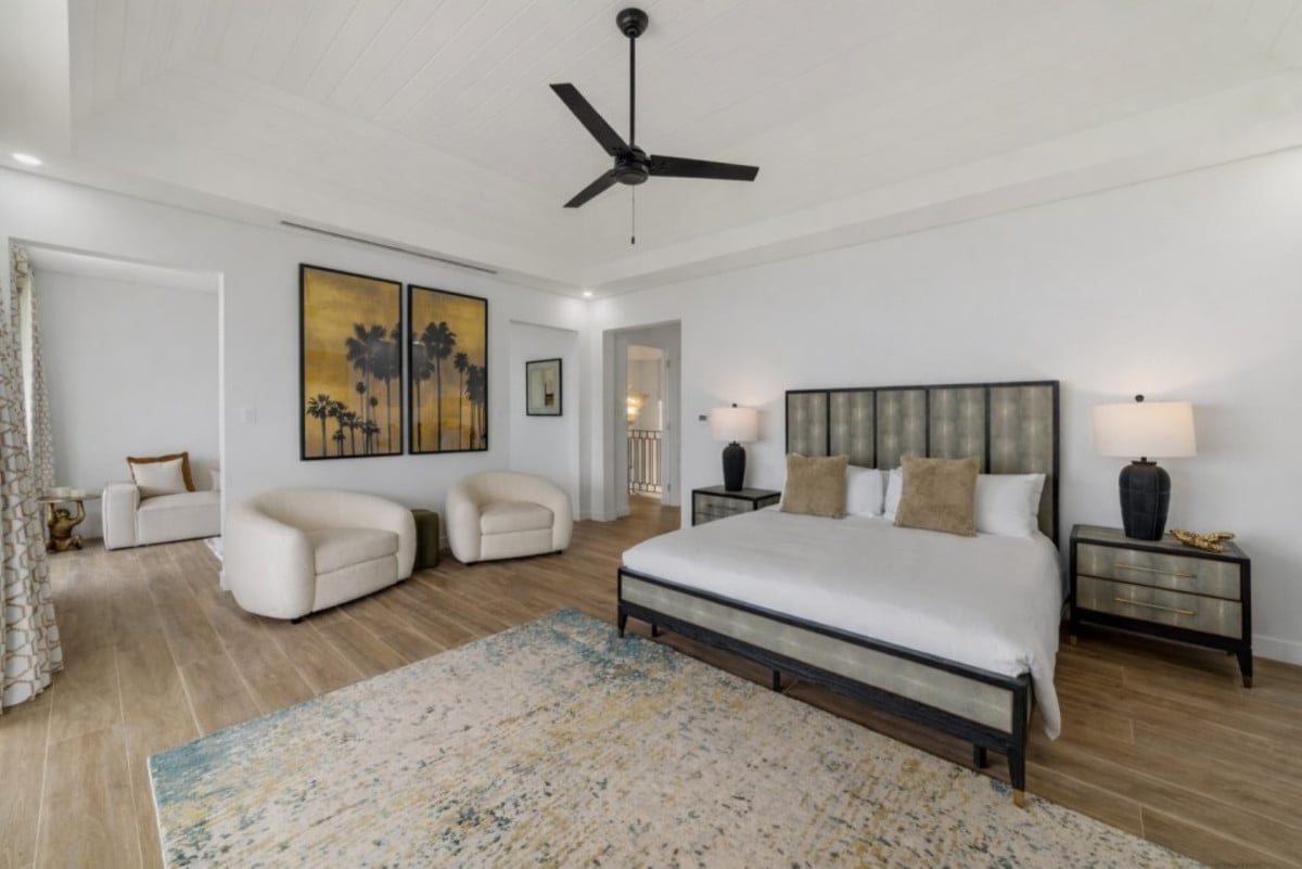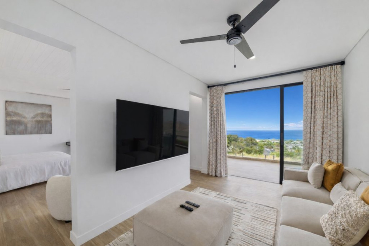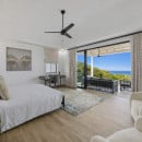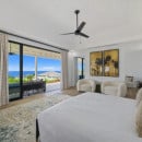 Upstairs is dedicated to privacy and indulgence. The impressive primary suite (15’ x 19’) includes a private TV lounge, a spa-inspired en-suite bathroom with a freestanding soaking tub and dual vanities, and direct access to the covered terrace. A second upstairs guest suite also opens onto the terrace, enjoying beautiful west-facing sea views and its own spacious bathroom.