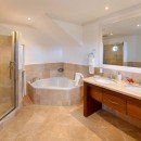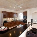 Up one level is the verandah with its al fresco lounging and dining. Stepping in through the enormous French doors brings you to the great room. With its white, pickled ceilings and colonial-style décor, it uses a palette of cream accented by bold red and richly stained mahogany to create a rich setting. A large living room with entertainment system, formal dining room, and kitchen are found here.