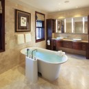 The expansive main villa features a lovely, large verandah alongside the pool, and it is furnished as a lounge and dining niche. It opens into the great room which features several living room and lounge areas, including a media room. The stunning, modern kitchen is on this level as well, and five of the bedrooms are in this building.