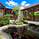 Villa Alila Barbados. Villa Alila on Sandy Lane is built with a flowing open plan design, each room leads on to another and each offers a glimpse of the breathtaking view. As you enter the grounds a lovely fountain greets you and as you walk through the entrance to the villa you are further soothed by oriental koi ponds gracing either side of the wooden walkway.