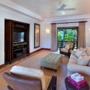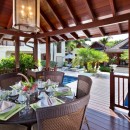 A large raised dining area that comfortably seats ten also includes a full wall water feature and is open along one side allowing for glorious views as you dine. The dining area leads down to a comfortable seating area, also open along one side offering views of the pool area, which in turn leads to a second comfortable seating area where you can relax with a little music or a movie.