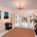 It butts against the enormous verandah, which is a dream in white stone and marble, and is furnished with additional dining and lounging areas. A fully-stocked bar is at the ready here too, and when the day is done, you can just step into the wonderful great room. Also done with a white palette, it uses bursts of color to create a dynamic and casual spot for lounging in the living room or heading to the kitchen.