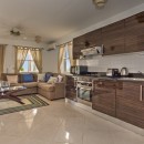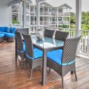 Inside, the great room is furnished in island style with another banquette creating a cozy lounge area and entertainment center. Nearby is the fabulous, gourmet kitchen and dining space. With the latest in modern appliances, even discerning chefs have all they need to make meals.