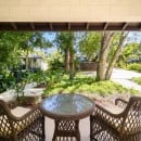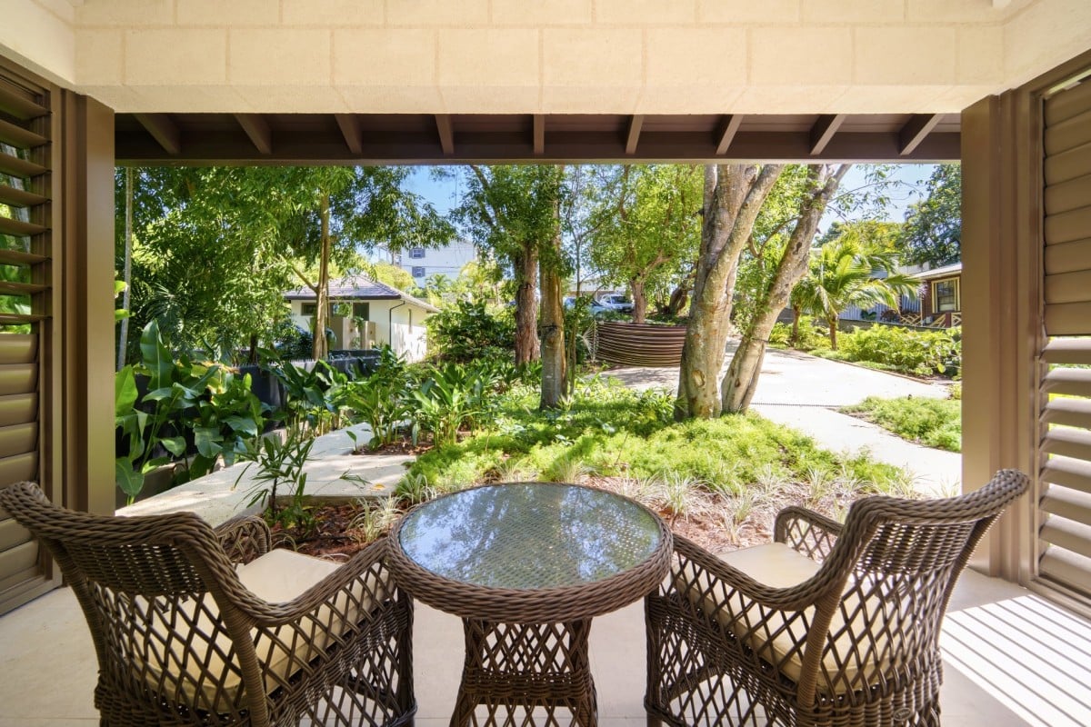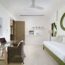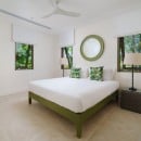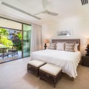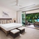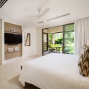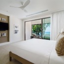 The third upstairs bedroom faces the garden and includes an ensuite shower. An additional balcony positioned between this bedroom and the snug provides another peaceful outdoor retreat to enjoy the island breeze. On the ground floor, two further air-conditioned bedrooms open onto private verandas with seating areas surrounded by tropical greenery, offering privacy and easy access to the pool and beachfront.