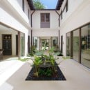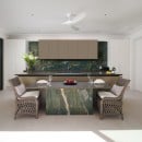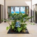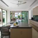 The villa’s open-plan layout connects the sleek modern kitchen — complete with a private chef’s preparation area — to the dining space and TV lounge. Wide sliding glass doors open directly onto the main terrace and private pool deck, creating seamless indoor–outdoor living. At the center of the home, a tranquil courtyard anchors the design, where three fountains and lush foliage enhance the villa’s serene atmosphere.