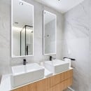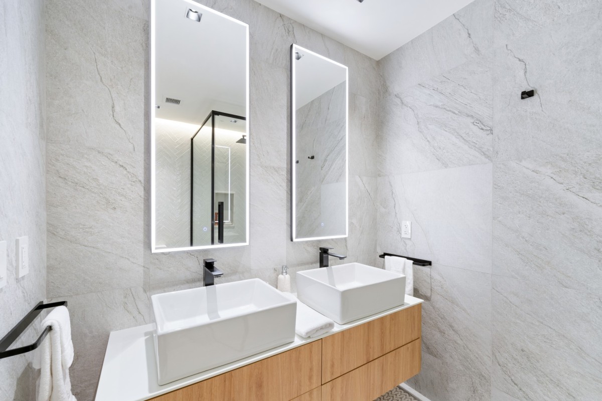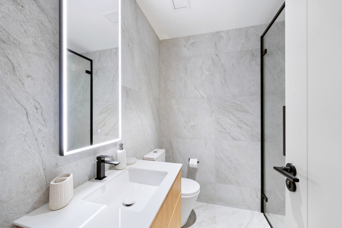 Both bedrooms are ensuite and thoughtfully designed for privacy and comfort. The primary suite enjoys sea-facing views and features a spa-style bathroom with elegant finishes, creating a peaceful retreat. The second bedroom is equally spacious, with generous closet space and its own ensuite bathroom. A separate powder room adds extra convenience for guests.