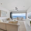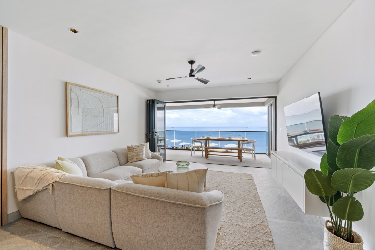 The open-plan living space is filled with natural light, thanks to floor-to-ceiling windows that frame uninterrupted views of the Caribbean. Step out onto your private patio to enjoy cool ocean breezes, morning coffee, or sunset drinks, all with the soothing sound of waves as your backdrop. Modern furnishings and bespoke design details create a comfortable and stylish space for relaxing after a day in the sun.