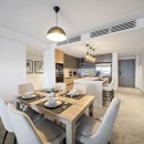 The fully equipped kitchen features premium appliances and a breakfast bar, which are ideal for preparing meals or entertaining guests. The adjacent dining area offers a cozy space for family meals, all while enjoying the magnificent sea view.