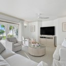The open-plan living and dining area extends onto a spacious, covered terrace—an inviting setting for morning coffee, casual lunches, or sunset drinks. A small bar nook adds a social touch, ideal for unwinding after a day by the water. The condo also includes a fully equipped kitchen and a dedicated laundry area, supporting longer, more comfortable stays.