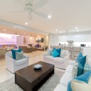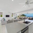 The villa’s lower level boasts an open-plan kitchen and a cozy seating area. Floor-to-ceiling glass bi-fold doors lead to a covered sitting area and alfresco dining space overlooking a private infinity pool, complete with sun loungers.